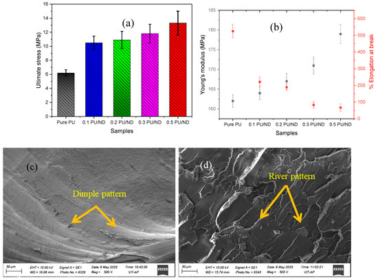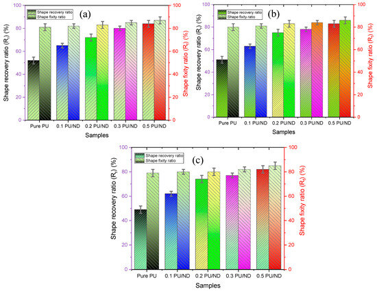 Shape-memory polymers (SMPs) are a unique class of smart materials capable of recovering their original shape upon external stimuli, with thermoresponsive polyurethane (PU) being one of the most widely studied systems. However, the relatively low mechanical strength, thermal stability, and durability of PU limit its broader functional applications. PU/ND composites containing 0.1–0.5 wt.% ND were fabricated via melt blending and injection molding method. The objective was to evaluate the effect of ND reinforcement on the mechanical, scratch, thermal, rheological, and shape-memory properties. Results show that tensile strength increased up to 114% and Young’s modulus by 11% at 0.5 wt.% ND, while elongation at break decreased due to restricted chain mobility. Hardness improved by 21%, and scratch resistance was significantly enhanced, with the coefficient of friction reduced by 56% at low loads. Thermal stability was improved, with the maximum degradation temperature shifting from 350 °C (pure PU) to 362 °C (0.5 wt.% PU/ND) and char yield increasing by 34%. DSC revealed an increase in glass transition temperature from 65 °C to 68.6 °C. Rheological analysis showed an 89% reduction in damping factor (tan δ), indicating enhanced elasticity. Shape-memory tests confirmed notable improvements in both shape fixity and recovery ratios across successive cycles compared to neat PU, with the highest enhancements observed for the 0.5 wt.% PU/ND nanocomposite—showing up to 7.6% higher fixity and 32% higher recovery than pure PU. These results demonstrate that ND reinforcement effectively strengthens PU while preserving and improving its shape-memory behavior, making the composites promising candidates for high-performance smart materials in sensors, actuators, and aerospace applications.