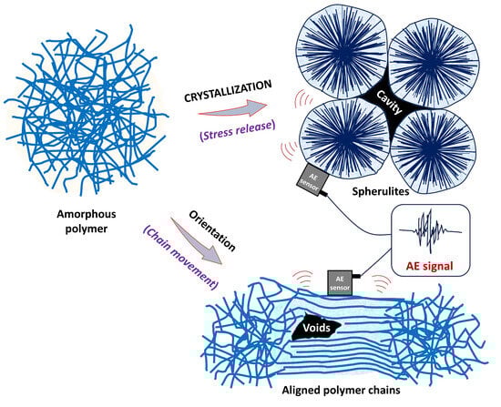 Acoustic Emission Mechanisms During Polymer Processing and Chain Orientation: From Amorphous to Crystalline