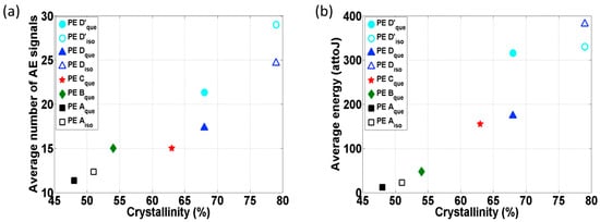 Acoustic emission (AE) technology has emerged as a highly sensitive and non-destructive method for the real-time monitoring of defect formation and microstructural changes during the manufacturing and early service life of polymeric materials and composites. This review highlights the fundamental principles and applications of AE in detecting crystallization-induced defects, such as cavities, dislocations, and microcracks, as well as plastic deformation mechanisms, including chain orientation, cavitation, and stress release. It is shown that AE activity correlates strongly with crystallinity and processing conditions, providing critical insights into microstructure–property relationships. The possible mechanisms can be the friction between grain boundaries, the local stress release, chain movement, phase changing, and fiber/filler debonding, among others. A comprehensive understanding can help with the prediction/prevention of early defects in the crystalline polymer processing. Furthermore, integrating AE with artificial intelligence and multi-sensor data fusion offers promising pathways toward smart, adaptive manufacturing systems capable of real-time quality control and early defect diagnosis in high-performance polymer composites.