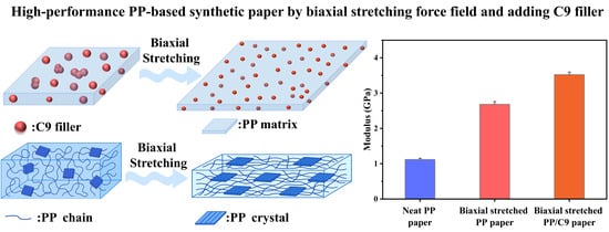 The widespread replacement of cellulose paper with polypropylene (PP)-based synthetic paper has been hindered by the relatively low stiffness and modulus of PP. Conventional approaches that incorporate rigid inorganic fillers can enhance the modulus but typically compromise processability and mechanical performance. In this work, we propose a dual strategy by introducing high-modulus organic hydrogenated resin fillers (C9) and applying a biaxial stretching force field. The biaxial stretching process not only promotes PP crystallization but also significantly improves the uniform dispersion of C9 fillers. As a result, a composite paper with ultrafine C9 dispersion and a crystalline self-reinforced structure was successfully fabricated. The composite exhibits a modulus that is 38% higher than that of biaxially stretched neat PP and 218% higher than that of unstretched neat PP. Furthermore, under biaxial stretching, the C9 fillers impart a toughening effect, effectively overcoming the conventional stiffness–toughness trade-off. This work therefore provides a promising strategy for the scalable fabrication of high-performance PP-based synthetic paper.