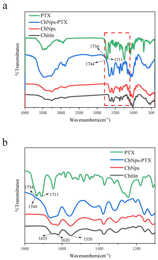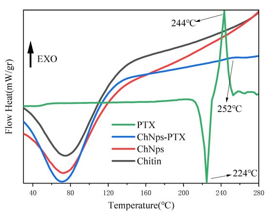 This study aims to investigate biodegradable and biocompatible chitin as a natural carrier for loading the hydrophobic anti-cancer drug paclitaxel (PTX) for the first time, resulting in a new loading system of chitin nanoparticles–paclitaxel (ChNps–PTX). The well-dispersed chitin nanoparticles (ChNps) and ChNps–PTX were prepared via a water-dripping regeneration method. The functional groups, crystal form, and the high degree of acetylation (DA = 96.03%) of ChNps did not change during regeneration, suggesting that ChNps retained the complete molecular structure of chitin. The average particle size of ChNps–PTX was approximately 93.11 nm, which was larger than that of ChNps (84.06 nm) because of loading PTX (the drug loading was approximately 8.01%). TEM and CLSM were employed to confirm PTX existence in ChNps–PTX, and the nano-strip PTX (30.52 ± 6.78 nm in length and 16.02 ± 2.77 nm in width) was found for the first time. Loading of PTX resulted in ChNps–PTX presenting a new characteristic peak at 1734 cm−1 in FT-IR spectra, a new peak at 2θ = 5.3° in XRD pattern, and a new exothermic peak (252 °C) in DSC curve. While ChNps–PTX showed a lower crystallinity (19.86%) compared with that of ChNps (24.11%) and chitin (36.77%), utilizing the chitin carrier and mild regeneration method to load PTX were highly beneficial for pharmaceutical fields.