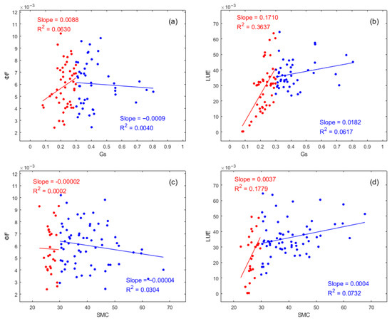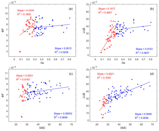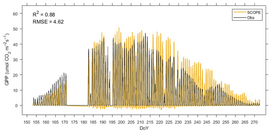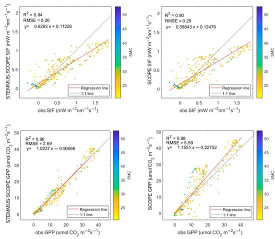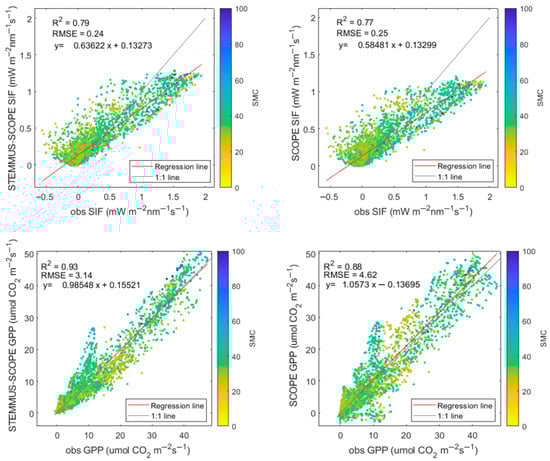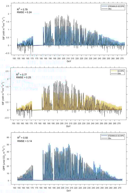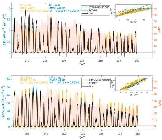 With advancements in solar-induced fluorescence (SIF) observation technology and the evolution of vegetation radiative transfer models, SIF signals can now be more effectively interpreted and leveraged from a mechanistic perspective. This, in turn, facilitates a deeper understanding of the mechanistic link between SIF and photosynthesis. Considering the impact of water stress on terrestrial ecosystems, this paper simulated SIF and gross primary productivity (GPP) values using the STEMMUS-SCOPE model at half-hour scales from 2017 to 2023 at the Daman site. The simulation results were compared and validated against flux tower observations and SCOPE model outputs. Taking advantage of irrigation events in the semi-arid irrigated farmland, we assessed the accuracy of STEMMUS-SCOPE in simulating SIF and GPP under drought stress, as well as its capability to quantitatively analyze the impacts of water stress on SIF and GPP. The results show that the accuracy of the SIF and GPP values simulated by the STEMMUS-SCOPE model is higher than that of the SCOPE model. The averaged R2 and RMSE between the SIF simulated by STEMMUS-SCOPE model and the observed SIF values are 0.66 and 0.29 mW m−2 nm−1, and the averaged R2 and RMSE between the GPP simulated by the STEMMUS-SCOPE model and the observed GPP values from 2017 to 2023 are 0.88 and 4.93 µmol CO2 m−2 s−1, respectively. Especially under relatively drought conditions, the R2 between the SIF simulated values and observed values is 0.84, and the R2 between the GPP simulated values and observed values is 0.96. By further combining soil moisture content (SMC) and canopy conductance (Gs) analyses, we found that the response of the STEMMUS-SCOPE simulations under water stress was consistent with previous findings on the impacts of water deficits, thereby confirming the model’s reliability for drought conditions. Under drought stress, the decline in fluorescence emission efficiency (ΦF) with decreasing Gs and SMC was smaller than that of the light use efficiency (LUE). Therefore, the STEMMUS-SCOPE model is promising for investigating the SIF–GPP relationship under drought stress.