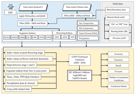 Alternate (irregular) bearing, characterized by large fluctuations in fruit yield between consecutive years, remains a major constraint to sustainable avocado (Persea americana) production. This study aimed to assess the potential of satellite remote sensing and climatic variables to characterize and predict alternate bearing patterns in commercial orchards in Tzaneen, Limpopo Province, South Africa. Historical yield data (2018–2024) from 46 “Hass” avocado blocks were analyzed alongside Sentinel-2 derived vegetation indices (NDVI, GNDVI, NDRE, CIG, CIRE, EVI2, LSWI) and flowering indices (WYI, NDYI, MTYI). To align temporal scales, all VIs and FIs were aggregated into eight quarterly averages from the two years preceding each yield year and spatially averaged across each orchard block. Climatic predictors including maximum temperature (Tmax), minimum temperature (Tmin), vapor pressure deficit (VPD), and precipitation were screened against historical yields to identify critical periods, with June–October emerging as the most influential months, and these variables were aggregated accordingly to match annual alternate bearing patterns. Five machine learning (ML) algorithms—Random Forest, XGBoost, CATBoost, LightGBM, and TabPFN—were trained and tested using a Leave-One-Year-Out (LOYO) approach. Results showed that VPD, Tmin, and Tmax during the flowering period (July–September) were the most influential variables affecting subsequent yields. TabPFN achieved the highest predictive accuracy (Accuracy = 0.88; AUC = 0.95) and strongest temporal generalization. Spectral gradients between flowering and early fruit drop were lower during “on” years, reflecting stable canopy vigor. This combined use of remote sensing and climatic variables in a ML framework represents a novel approach, and the findings demonstrate that integrating remote sensing and climatic indicators enables early discrimination of “on” and “off” years, supporting proactive orchard management and improved yield stability.