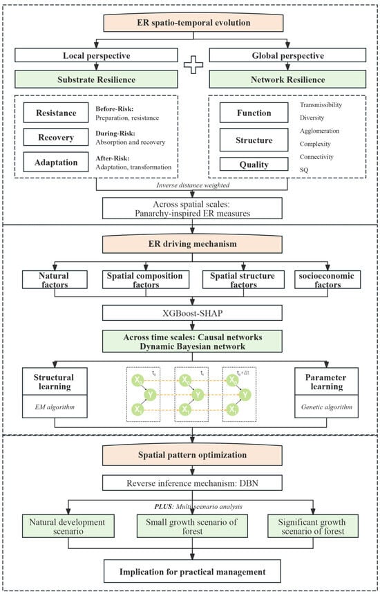 Environmental degradation from rapid urbanization significantly threatens ecological resilience (ER). Nevertheless, accurately evaluating ER remains a persistent challenge. Prior studies’ limited attention to resilience’s cross-scale complexity has hindered evidence-based management. This study, based on long-term time series remote sensing and multi-source data, developed