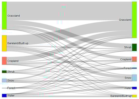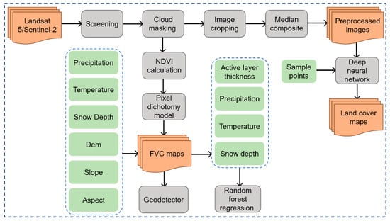 Changes in vegetation coverage reflect the status and dynamic processes of ecosystems and serve as a crucial foundation for regional ecological protection. Using Landsat-5 and Sentinel-2 data, this study calculated the vegetation coverage in the Three-River Headwaters (TRH) region from 1990 to 2022 with the pixel dichotomy model, identified land cover changes over the past three decades via a deep neural network, and analyzed the primary influencing factors behind vegetation coverage dynamics. The results indicate that vegetation coverage in TRH has generally increased, as very high vegetation coverage expanded by 10.3%, while very low and low vegetation coverage decreased by 4.2%. Extensive bare land in the western region decreased and transformed into grassland, while the areas of shrubland and forest in the central and eastern TRH areas increased. The areas of grassland, shrubland, and forest increased by 3.7 × 104 km2, 2.1 × 104 km2, and 4.7 × 103 km2, respectively. Precipitation, elevation, and temperature are the main factors influencing the spatial variation in vegetation coverage. We found that the contributions of the permafrost active layer thickness and precipitation to changes in vegetation coverage are high. Finally, we provide a detailed and timely analysis of recent vegetation distribution and type changes on the Tibetan Plateau, offering a strengthened scientific foundation for monitoring, assessment, and ecological conservation efforts aimed at supporting ecosystem restoration in the region.
