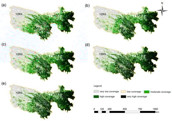 Changes in vegetation coverage reflect the status and dynamic processes of ecosystems and serve as a crucial foundation for regional ecological protection. Using Landsat-5 and Sentinel-2 data, this study calculated the vegetation coverage in the Three-River Headwaters (TRH) region from 1990 to 2022
