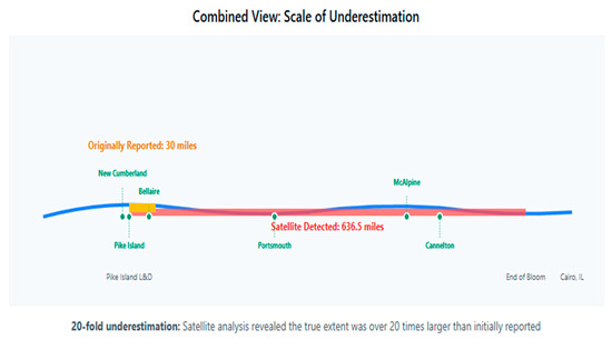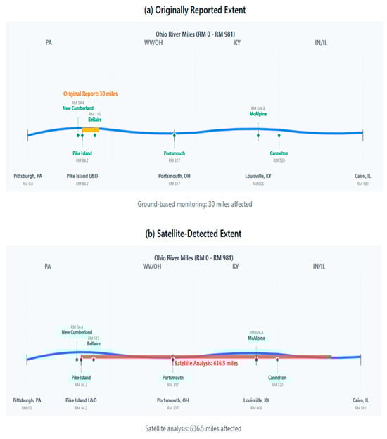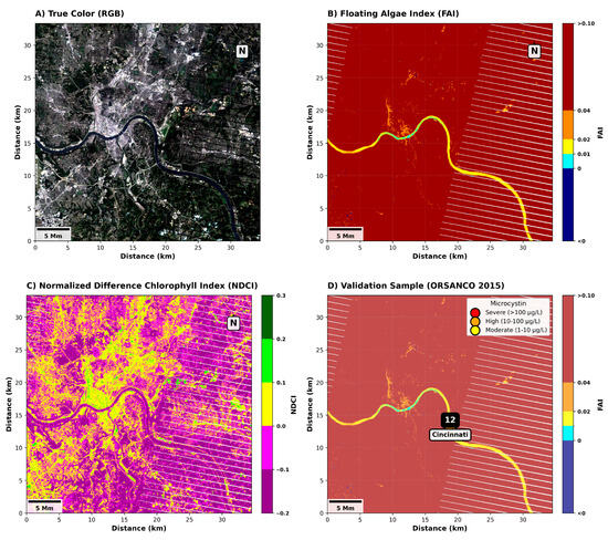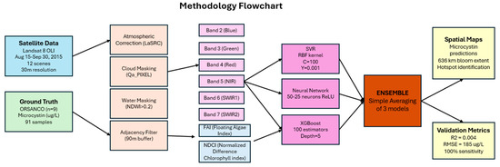 Harmful Algal Blooms (HABs) in large river systems present significant challenges for water quality monitoring, with traditional in-situ sampling methods limited by spatial and temporal coverage. This study evaluates the effectiveness of machine learning techniques applied to Landsat spectral data for detecting and quantifying HABs in the Ohio River system, with particular focus on the unprecedented 2015 bloom event. Our methodology combines Google Earth Engine (GEE) for satellite data processing with an ensemble machine learning approach incorporating Support Vector Regression (SVR), Neural Networks (NN), and Extreme Gradient Boosting (XGB). Analysis of Landsat 7 and 8 data revealed that the 2015 HAB event had both broader spatial extent (636.5 river miles) and earlier onset (5–7 days) than detected through conventional monitoring. The ensemble model achieved a correlation coefficient of 0.85 with ground-truth measurements and demonstrated robust performance in detecting varying bloom intensities (R2 = 0.82). Field validation using ORSANCO monitoring stations confirmed the model’s reliability (Nash-Sutcliffe Efficiency = 0.82). The integration of multispectral indices, particularly the Floating Algae Index (FAI) and Normalized Difference Chlorophyll Index (NDCI), enhanced detection accuracy by 23% compared to single-index approaches. The GEE-based framework enables near real-time processing and automated alert generation, making it suitable for operational deployment in water management systems. These findings demonstrate the potential for satellite-based HAB monitoring to complement existing ground-based systems and establish a foundation for improved early warning capabilities in large river systems through the integration of remote sensing and machine learning techniques.