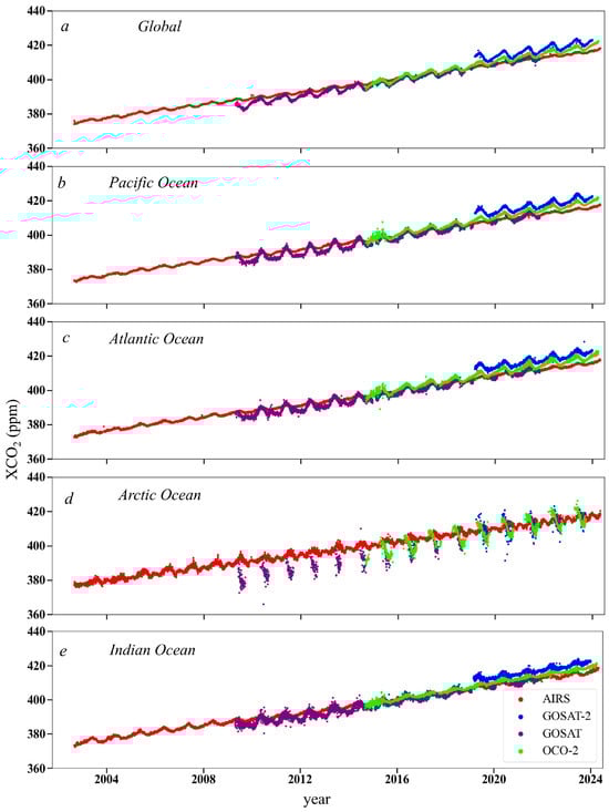 Atmospheric carbon dioxide in mole fraction (XCO2) is one of the key parameters in estimating CO2 fluxes at the air–sea interface. Satellite-derived column-averaged XCO2 has been widely used in the estimates of air–sea CO2 fluxes, yet the uncertainties induced by using column-averaged XCO2 instead of atmospheric XCO2 in the ocean boundary layer have been generally unknown. In this study, based on an extensive dataset of atmospheric XCO2 measured in the ocean boundary layer from global ocean mooring arrays (N = 945,243) and historical cruises (N = 170,000) between 2002 and 2024, for the first time, we quantitatively evaluated the performance of four satellites, including the Greenhouse gases Observing SATellite (GOSAT and GOSAT-2), the Orbiting Carbon Observatory-2 (OCO-2), and the Atmospheric InfraRed Sounder (AIRS), in monitoring the atmospheric XCO2 over oceanic regions. The atmospheric XCO2 has been increasing from 375 ppm in 2002 to 417 ppm in 2024 based on the longest data record from AIRS. We found that the column-averaged atmospheric XCO2 can serve as a good proxy for atmospheric XCO2 in the ocean boundary layer, with associated uncertainties of 2.48 ppm (0.46%) for GOSAT, 1.01 ppm (0.24%) for GOSAT-2, 2.45 ppm (0.45%) for OCO-2, and 4.22 ppm (0.83%) for AIRS. We also investigated the consistency of these satellites in monitoring the growth rates of atmospheric XCO2 in the global ocean basins. Based on the longest data record from AIRS, the atmospheric XCO2 has been increasing at a rate of 1.87–1.97 ppm year−1 over oceanic regions in the past two decades. These findings contribute to improving the reliability of satellite-derived column-averaged XCO2 observations in the estimates of air–sea CO2 fluxes and support future efforts in monitoring ocean carbon dynamics through satellite remote sensing.