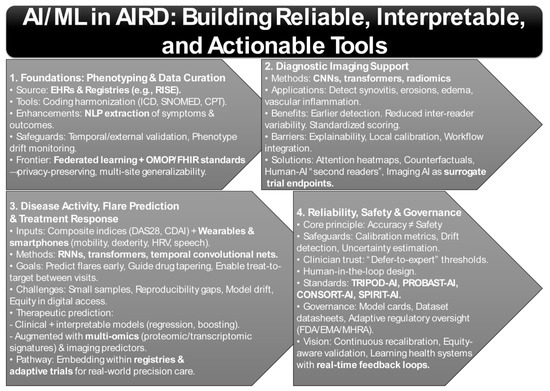 Background/Objectives: Autoimmune rheumatic diseases (AIRDs) are complex, heterogeneous, and relapsing–remitting conditions in which early diagnosis, flare prediction, and individualized therapy remain major unmet needs. This review aims to synthesize recent progress in AI-driven, biomarker-based precision medicine, integrating advances in imaging, multi-omics, and digital