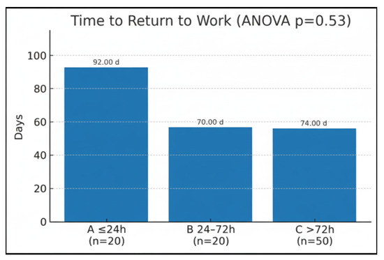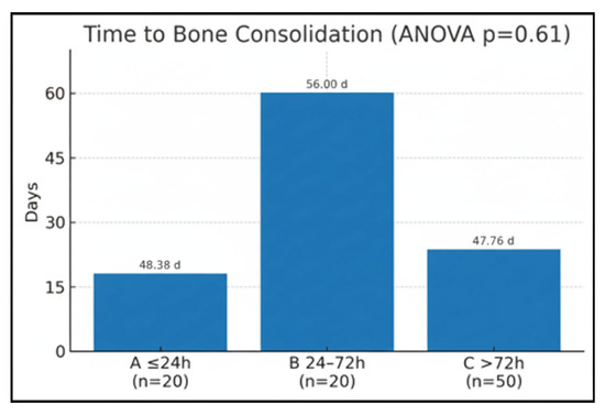 Background: Open phalangeal fractures raise timing questions that may not mirror long-bone protocols. We aimed to test whether time-to-surgery is associated with infection, time to union, and return to work. Methods: A single-centre retrospective cohort study was conducted between October 2023 and January 2025. Adults with open phalangeal fractures were grouped by time-to-surgery: ≤24 h (A), 24–72 h (B), and ≥72 h (C). Primary outcome was infection while secondary outcomes were time to radiographic union and time to return to work. Results: Ninetypatients were finally included. Baseline demographics and injury characteristics did not differ significantly among groups (all p >0.05). Infection occurred in 10/90 patients (11%); rates were similar across the three windows—10%, 10%, and 12%—with no association between timing and infection (χ2 = 0.09; p =0.96). Mean time to union was 48.4 ± 16.2, 56.0 ± 2.9, and 47.8 ± 14.4 days for the ≤24 h, 24–72 h, and ≥72 h groups, respectively, without significant between-group differences (p = 0.61). Return to work occurred at 92.0 ± 25.5, 70.0 ± 17.3, and 74.0 ± 46.0 days, again with no significant difference by timing (p = 0.53). Overall, no clinically meaningful trend favoured earlier surgery within the studied windows. Conclusions: In this heterogeneous yet clinically representative cohort of open phalangeal fractures, surgical timing up to and beyond 72 h was not associated with infection, time to union, or time to return to work. These findings support individualized decision-making, while larger prospective studies are needed to refine timing thresholds.