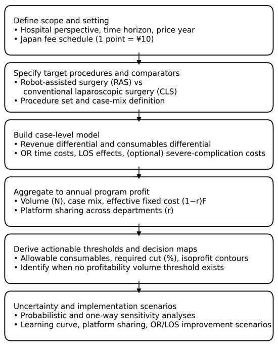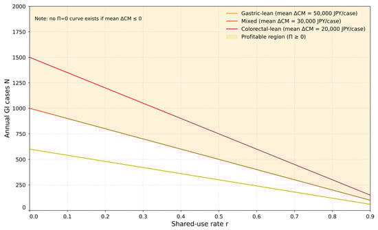 Background/Objectives: Robot-assisted gastrointestinal (GI) cancer surgery has expanded in Japan since national reimbursement in 2018, yet hospital profitability remains uncertain because of capital, maintenance, and consumable costs. We examined whether a program-level volume threshold for profitability exists under Japan’s fee schedule and quantified actionable improvement targets. Methods: We developed a hospital-perspective, model-based economic evaluation (index admission to 30 days; 2025 Japanese yen (JPY)) comparing robot-assisted surgery (RAS) with conventional laparoscopic surgery (CLS) under Japan’s fee schedule (one point = ¥10) for gastrectomy, colectomy, rectal resection, and pancreatoduodenectomy. Case-level contribution margin differentials (ΔCM) were defined as the revenue differential minus the consumables differential and additional operating room (OR) time costs, plus savings from reduced length of stay (LOS), and were aggregated to annual program profit (Π) after fixed costs and platform sharing. Primary outputs were allowable consumables, required cut (%), and isoprofit contours. Uncertainty was assessed using 50,000-iteration probabilistic sensitivity analysis (PSA), one-way sensitivity analysis (OWSA), and learning-curve scenarios in line with Consolidated Health Economic Evaluation Reporting Standards (CHEERS) 2022. Results: In the base case, ΔCM was predominantly ≤0 for colon, rectum, and pancreatoduodenectomy; therefore, when the case-mix-weighted mean ΔCM was ≤0, increasing volume could not achieve breakeven and instead increased losses. Each 10 min reduction in OR time increased allowable consumables by ¥15,000, and each bed-day reduction increased it by ¥30,000. These required-cut and isoprofit maps provide actionable targets for cost negotiation, operational improvement, and platform sharing. Conclusions: Volume expansion alone rarely yields profitability; coordinated reductions in consumables, OR time, and LOS, together with platform sharing, are required.