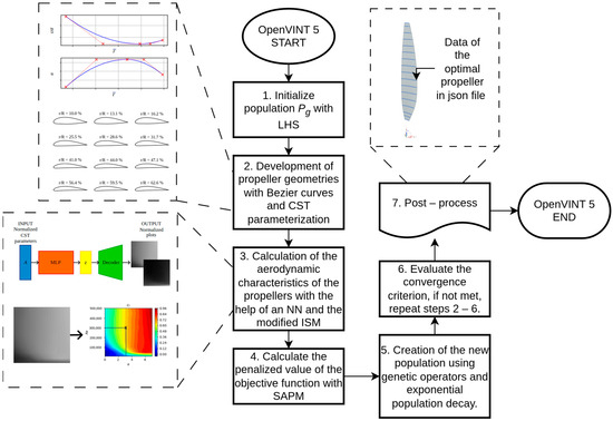 This article presents aircraft propeller optimal design technology; including an algorithm and OpenVINT 5 code. To achieve greater geometric flexibility, the proposed technique implements Class-Shape Transformation (CST) parameterization combined with Bézier curves, replacing the previous fully Bézier-based system. Performance improvements in the optimization process are accomplished through deep learning models and a genetic algorithm, which substitute XFOIL and Differential Evolution-based approaches, respectively. The scientific novelty of the article lies in the application of a neural network to predict the aerodynamic characteristics of profiles in the form of contour diagrams, rather than scalar values, which execute the neural network repeatedly per ISM algorithm iteration and speed up the design time of propeller blades by 32 times as much. A propeller for an aircraft-type UAV was designed using the proposed methodology and OpenVINT 5. A comparison was made with the results to solve a similar problem using numerical mathematical models and experimental studies in a wind tunnel.