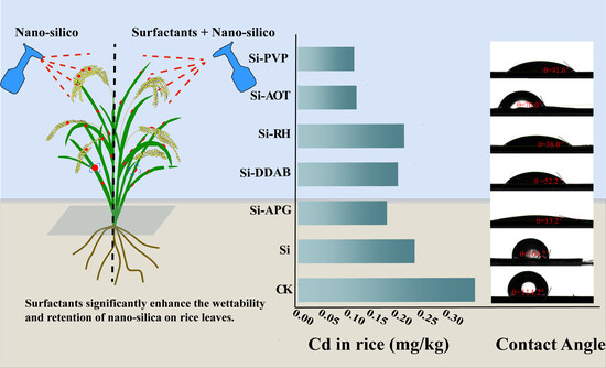 Cadmium (Cd) accumulation in rice poses a serious threat to global food safety and human health. Foliar application of nano-silica (Si) offers a promising remediation strategy, but its efficacy is often limited by poor droplet retention on hydrophobic leaf surfaces. This study hypothesized that surfactants could overcome this barrier by enhancing the foliar performance of nano-Si. Through field experiments, we evaluated the synergistic effects of five surfactants (Polyvinylpyrrolidone (PVP) powder, Aerosol OT (AOT), Rhamnolipid (RH), Didecyldimethylammonium bromide (DDAB), and Alkyl Polyglycoside (APG)) when combined with nano-silica. The results demonstrated that all surfactants significantly improved wetting and retention, with alkyl polyglycoside (APG) and polyvinylpyrrolidone (PVP) being the most effective. These improvements translated into a remarkable suppression of Cd translocation within rice plants. The PVP–nano-Si combination emerged as the most potent treatment, reducing grain Cd content by 50% and achieving the lowest levels of As and Cr among all treatments. Furthermore, this synergistic effect was linked to a significant increase in grain concentrations of manganese (Mn) and zinc (Zn), which exhibit a competitive relationship with Cd. The findings reveal that surfactant co-application not only optimizes the physical application of nano-Si but also triggers beneficial nutrient–Cd interactions, providing a novel and efficient strategy for mitigating Cd contamination in rice. This study provides critical theoretical support for developing efficient and environmentally friendly foliar barrier technologies and supports safe production of rice in lightly to moderately contaminated paddy fields.