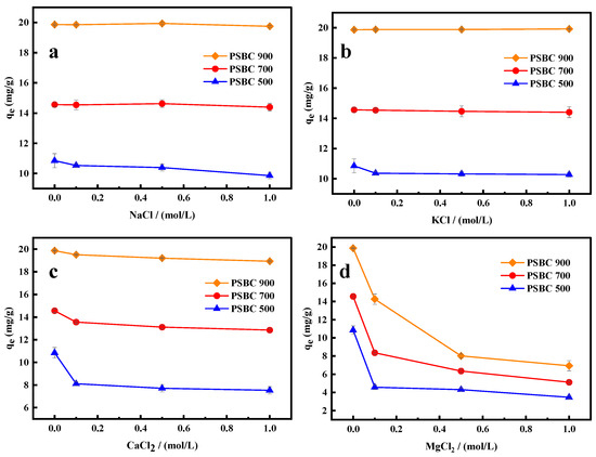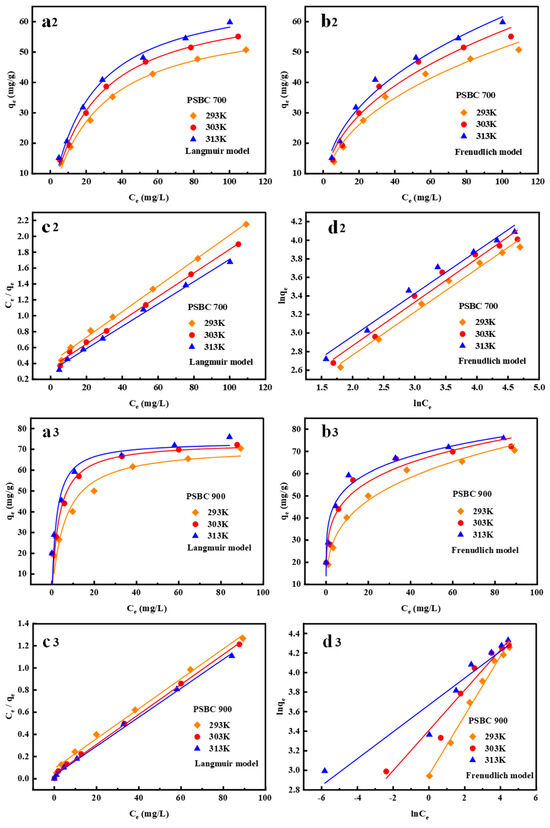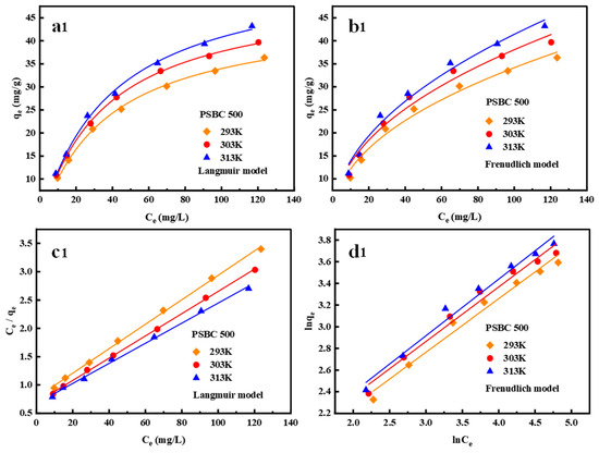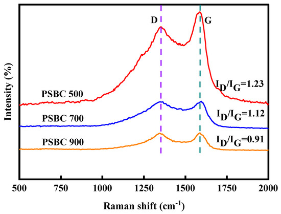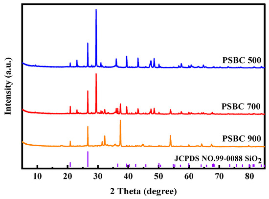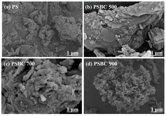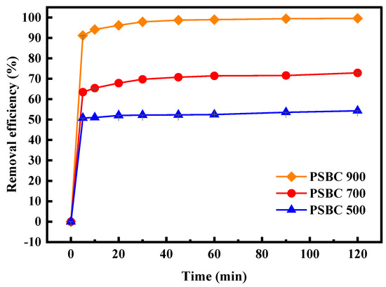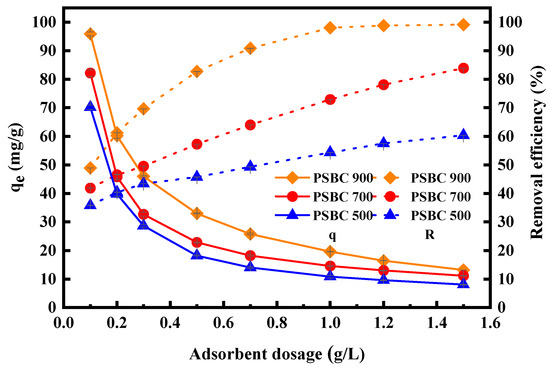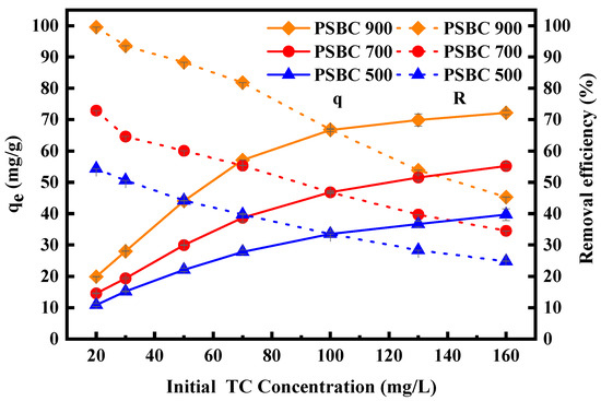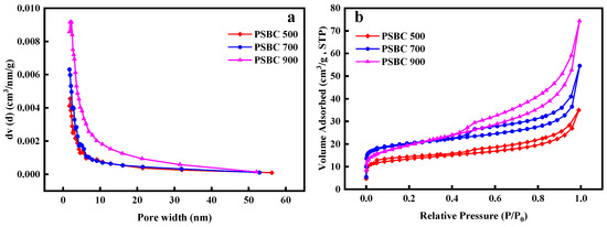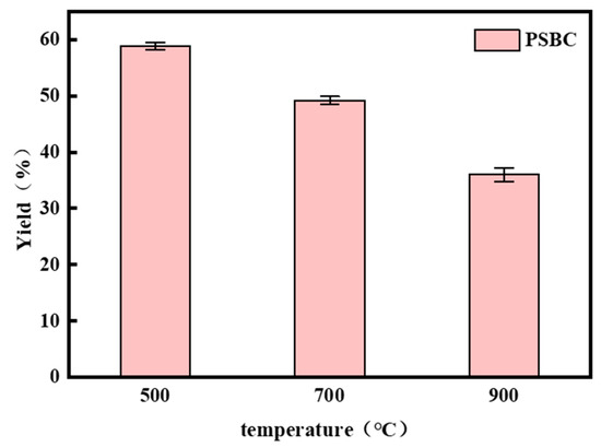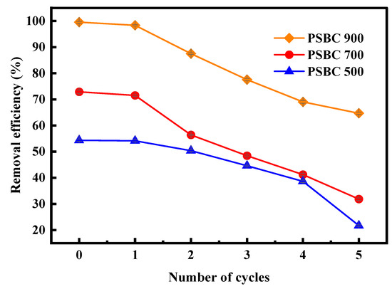 Papermaking sludge, rich in intrinsic resource value, is effectively barred from direct deployment in environmental remediation, agriculture, or energy generation by its pronounced contaminant burden. Pyrolytic conversion into high-value paper sludge biochar, such as papermaking sludge biochar (PSBC) provides a green, efficient portal for closing its resource loop. In this study, papermaking sludge was converted into a series of paper sludge biochars (PSBCs) via oxygen-limited pyrolysis at 500–900 °C. The porous architecture, surface physicochemical properties, and crystalline structure of the biochars were comprehensively characterized, and their performance for aqueous tetracycline (TC) removal was systematically quantified. Pyrolysis at 900 °C afforded PSBC 900 with the lowest yield (36.05%) yet the highest Brunauer–Emmett–Teller (BET) surface area (79.53 m2/g), an extensively developed mesopore network, and the greatest degree of graphitization. Across an initial tetracycline (TC) concentration window of 20–160 mg/L, PSBC 900 delivered an equilibrium capacity (qe) of 72.22 mg/g, outperforming PSBC 700 and PSBC 500 by factors of 1.3 and 1.8, respectively. Optimal uptake was achieved at a dosage of 1.0 g/L, pH 7, and 120 min contact time. Among the background cations examined, Mg2+ exerted a pronounced inhibitory effect, whereas Na+, K+, and Ca2+ exerted negligible interference. The adsorption process was accurately described by the pseudo-second-order kinetic model and the Langmuir isotherm (R2 > 0.999), yielding a theoretical maximum capacity (qm) of 76.39 mg/g for PSBC 900 at 313 K. Thermodynamic parameters ( < 0, > 0, > 0) confirm a spontaneous, endothermic, and entropy-driven process. After five consecutive adsorption–desorption cycles, PSBC 900 retained >64.68% of its original efficiency, demonstrating excellent regenerability. Paper sludge biochar enables a “waste-to-treat-waste” strategy for the efficient abatement of tetracycline, offering an economically viable and high-performance technology that advances the remediation of tetracycline-laden wastewaters.