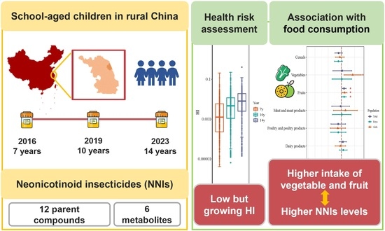Neonicotinoid insecticides (NNIs) are globally pervasive, and toxicological evidence indicates potential adverse effects from low-dose exposure in non-targeted organisms. Humans may be exposed to NNIs through multiple pathways, such as ingestion and inhalation, with dietary intake recognized as the dominant exposure route. However, longitudinal evidence characterizing evolving exposure patterns in rural children remains scarce. We evaluated temporal trends and dietary determinants of NNI exposure among 643 children at ages 7, 10, and 14 years in the Sheyang Mini Birth Cohort Study. Twelve NNIs and six metabolites in urine samples were measured using UPLC-HRMS; estimated daily exposure doses and hazard index (HI) were calculated, and linear mixed models were used to evaluate dietary determinants of NNI exposure. Widespread exposure was observed (ΣNNIs detection: 98.8–100%), and although cumulative risks remained below safety thresholds, both medians and upper bounds of HI increased with age (0.0007 to 0.0074; 0.2045 to 0.4054). Notably, exposure composition shifted, with declining imidacloprid and emerging dominance of clothianidin (CLO) and thiamethoxam (THM). Fruit and vegetable intakes were positively associated with ΣNNIs, whereas cereals, poultry, and eggs showed inverse associations, with more pronounced effects observed in boys. These findings indicated persistent yet evolving exposure risks in school-aged children, highlighting fruits and vegetables as major contributors. Although current toxicological risk appears low, the transition toward CLO and THM—compounds with limited chronic toxicity data—underscores the need for continued biomonitoring and targeted exposure mitigation.