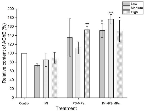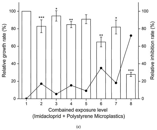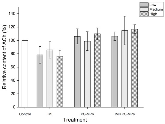 Imidacloprid (IMI) and polystyrene microplastics (PS-MPs) are common environmental pollutants, posing potential risks to ecosystems and human health. However, there is limited research on their toxic effects on nerve cells, particularly under combined exposure conditions. This study aimed to evaluate the toxic effects of IMI and PS-MPs alone and in combination on rat neuroblastoma B104 cells. Based on a cell viability assay (48 h), the No Observed Adverse Effect Levels of IMI and PS-MPs were 260 mg/L and <150 mg/L, respectively. To study their effects on the cholinergic system and oxidative stress, similar concentrations of IMI (2.6, 26, 260 mg/L) and PS-MPs (3, 30, 300 mg/L), alone and in combination, were exposed to B104 cells for 48 h. The results showed that IMI alone decreased acetylcholine (ACh) and acetylcholinesterase (AChE) contents, PS-MPs alone increased ACh and AChE contents, and under the combined condition, the effect of PS-MPs predominated over IMI. Both IMI and PS-MPs alone decreased the ratio of reduced glutathione (GSH) to oxidized glutathione (GSSG), indicating oxidative stress, and under the combined condition, the ratio of GSH/GSSG decreased more, but were less than the sum of the decreases that were observed under treatment by both compounds alone. The combined exposure exhibited antagonistic effects on all endpoints. Results of this study provides a scientific basis for the environmental risk assessment of microplastics and neonicotinoid pesticides.
