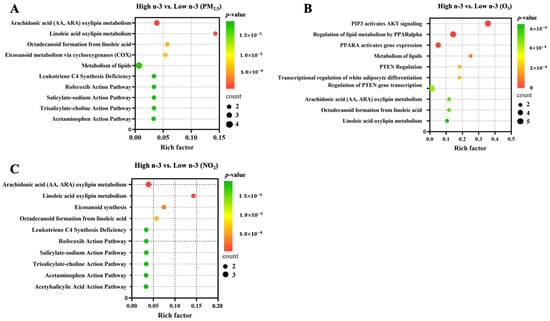 Oxylipins are specialized lipid mediators that can have dual functions, either promoting inflammation or supporting resolution. Exposure to air pollution is associated with systemic inflammation that may be modified by oxylipins derived from polyunsaturated fatty acids (FA). In this study, we examined whether short-term air pollution exposure is associated with changes in circulating oxylipins in healthy adults, who were on high- or low-dietary omega-3 fatty acid (n-3 FA) intakes. We measured 56 oxylipin species from participants’ plasma samples and employed mixed-effects models to assess the associations, stratified by n-3 FA groups. Plasma concentrations of oxylipins derived from n-3 FA [e.g., 14-hydroxydocosahexaenoic acid (14-HDHA) & 11-hydroxydocosahexaenoic acid (11-HDoHE), and 12-hydroxyeicosapentaenoic acid (12-HEPE)] were significantly higher in the high n-3 FA group compared to the low group. Conversely, selected oxylipins derived from n-6 FA [e.g., 15-hydroxyeicosatetraenoic acid (15-HETE) and 14,15-Dihydroxyeicosatrienoic acid (14,15-DiHETrE)] were significantly lower in the high n-3 group. Exposure to PM2.5, O3, and NO2 was associated with reductions in pro-inflammatory oxylipins produced by lipoxygenase in the high n-3 FA group, but not in the low group; for example, 12-HETE. Furthermore, participants in the high n-3 group exposed to PM2.5, O3, and NO2 had elevated levels of n-3 FA-derived pro-resolving oxylipins compared to those in the low n-3 group; for instance, 12-HEPE and 14-HDHA & 11-HDoHE. In conclusion, short-term air pollution exposure was associated with lower pro-inflammatory and higher pro-resolving oxylipin levels in the high n-3 FA group. These findings suggest n-3-derived lipid metabolites may promote inflammation resolution induced by air pollution.