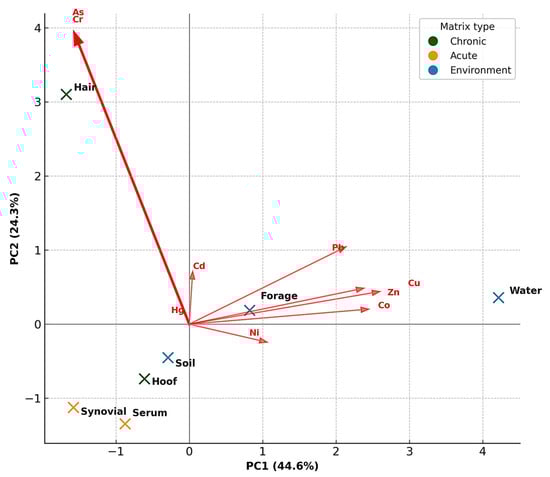 Environmental contamination with heavy metals, resulting from industrialization, urbanization, and agricultural intensification, poses serious ecological and health risks. Horses, due to their grazing behavior and close association with human environments, serve as reliable sentinel species for assessing environmental pollution. This study aimed to evaluate the bioaccumulation of heavy metals and trace elements in different biological matrices of horses—blood, hair, hooves, and synovial fluid—and to investigate their relationship with hematological biomarkers as indicators of physiological stress. Samples were collected from horses raised in anthropogenically influenced areas and analyzed using inductively coupled plasma mass spectrometry (ICP–MS). Hematological parameters were determined with an automated analyzer to assess systemic effects. The results revealed significant variations in metal concentrations among matrices, with keratinized tissues reflecting long-term exposure, while blood and synovial fluid indicated recent contamination. Correlations between elevated metal levels and altered hematological values suggested oxidative stress and adaptive physiological responses. These findings demonstrate the value of multi-matrix biomonitoring in evaluating both environmental quality and animal health. Horses effectively reflect the cumulative impact of heavy metal exposure, supporting their role as bioindicators within a One Health framework that links environmental, animal, and human well-being.