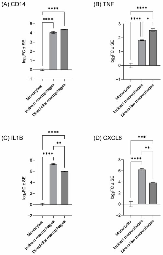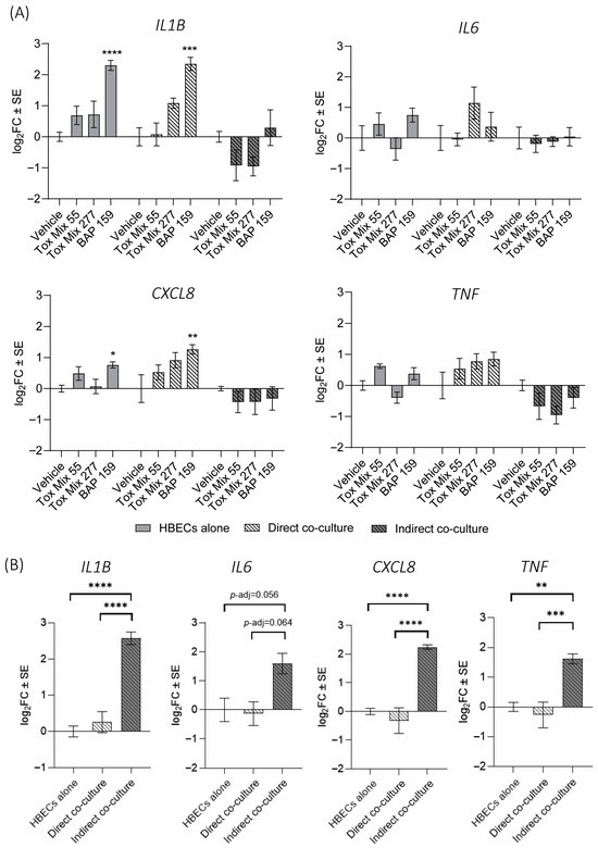 The development of new approach methodologies that include human cells differentiated into organotypic formats is of high interest due to their structural and functional similarities to tissues in vivo, enabling mechanistic understanding and translation to adverse health outcomes in humans. However, these systems often fail to capture complex intercellular signaling required for processes such as pulmonary inflammation induced by polycyclic aromatic hydrocarbons (PAHs). To investigate airway epithelial–macrophage interactions in response to benzo[a]pyrene and a PAH mixture (Tox Mix), co-culture models utilizing primary human bronchial epithelial cells (HBECs) differentiated at the air–liquid interface were cultured with THP-1 macrophages either directly or indirectly, alongside HBECs alone. After 24 h of exposure, cytokine expression (IL1B, IL6, CXCL8, TNF) as well as PAH biomarkers previously identified for chemical metabolism (CYP1A1, CYP1B1), oxidative stress (ALDH3A1, HMOX1, NQO1), and barrier integrity (TJP2) were evaluated. Cytotoxicity and barrier integrity were also assessed. HBECs alone and direct co-cultures exhibited similar responses after PAH treatment, while indirect co-cultures showed lower sensitivity to induction of inflammatory cytokines and CYP1A1 and CYP1B1 biomarker expression following exposure to PAHs. The expression of other biomarkers, including ALDH3A1, HMOX1, and NQO1, remained largely consistent across all models after treatment. Overall, these findings suggest that direct co-culture systems may provide a more physiologically relevant platform for studies of PAH-induced toxicity and demonstrate that the configuration of co-culture systems can influence cellular responses to chemical exposure.