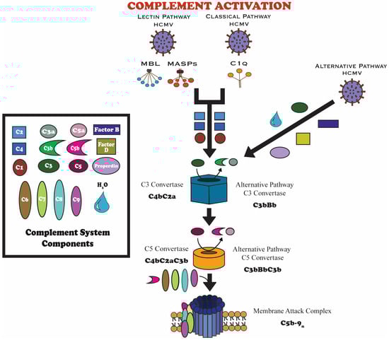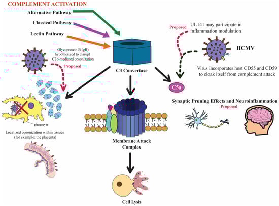 Congenital human cytomegalovirus (HCMV) infection is the most common vertically transmitted viral infection, and it affects 1 in 200 live births worldwide. While neonates are often asymptomatic at birth, congenital HCMV infection can result in long-term complications, including microcephaly, sensorineural hearing loss, and neurodevelopmental abnormalities. Developing antiviral strategies for the treatment and prevention of congenital HCMV infections is a global public health priority. However, licensed anti-HCMV vaccines are not yet available, and therapeutic options for use during pregnancy remain limited. The complement system is a crucial component of the innate immune system that plays essential roles in both fetal development and maternal defense against infectious pathogens. In cases of congenital HCMV infection, complement may contribute to the successful containment of the virus, but dysregulation and overactivation could concurrently drive tissue-damaging inflammation. This review discusses the known roles of the complement system in fetal development and in HCMV pathogenesis and synthesizes existing research to develop the hypothesis that a dysregulated complement system is a key mechanism in the development of congenital HCMV-related pathogenesis and neurodevelopmental sequelae. We explore how HCMV may perturb the complement system during pregnancy and use one inhibitor example to illustrate the broader potential of targeting complement in limiting disease.