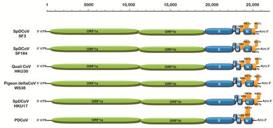 Porcine deltacoronavirus (PDCoV) is an emerging enteric pathogen in pigs and a newly recognized zoonotic coronavirus in humans. Genetic analyses suggest that PDCoV originated from avian deltacoronaviruses, with sparrow deltacoronaviruses (SpDCoVs) being the most closely related. House sparrows (Passer domesticus) frequently
