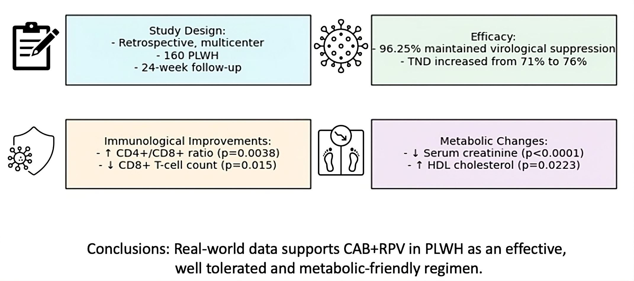 Background: Long-acting injectable antiretroviral therapy (LA-ART) with cabotegravir and rilpivirine (CAB + RPV) has emerged as a promising alternative to daily oral regimens for people living with HIV (PLWH), particularly those facing adherence challenges. While clinical trials have demonstrated its efficacy, real-world evidence remains limited. Methods: This retrospective, multicenter study evaluated the efficacy and safety of CAB + RPV in 160 virologically suppressed PLWH across eight Italian infectious disease units. Participants received intramuscular CAB (600 mg) and RPV (900 mg) every eight weeks without an oral lead-in phase. Clinical, immunological, and biochemical parameters were assessed at baseline and after 24 weeks. Results: At week 24, 96.25% of participants maintained virological suppression, and the proportion of individuals with target-not-detected viral load increased from 71% to 76%. Only one case of virological failure was observed. Significant immunological improvements included an increase in the CD4+/CD8+ ratio (p = 0.0038) and a reduction in CD8+ T-cell count (p = 0.0150). Biochemical analysis showed a decrease in serum creatinine (p < 0.0001) and an increase in HDL cholesterol (p = 0.0223). Treatment discontinuation occurred in 3.75% of participants, primarily due to adverse events or psychological factors. Conclusions: CAB + RPV demonstrated high efficacy and tolerability in a real-world setting, with favorable immunological and metabolic outcomes. These findings support its use as a viable therapeutic option for PLWH, especially those with adherence barriers. Further long-term studies are warranted to confirm these results across broader populations.