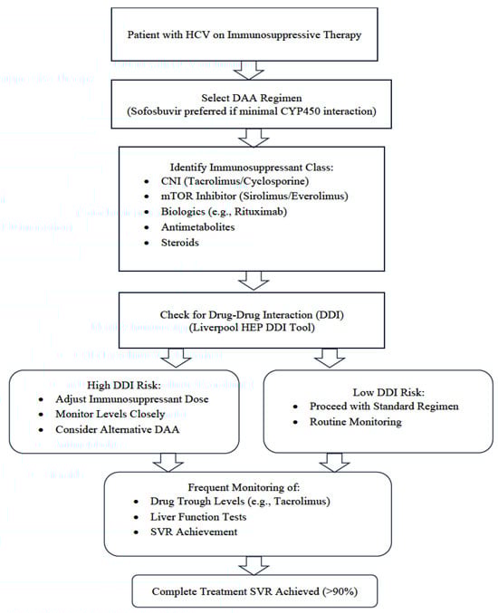 Direct-acting antivirals (DAAs) have transformed hepatitis C virus (HCV) management, offering high cure rates, favorable safety, and simplified regimens. Management in immunosuppressed patients remains challenging due to drug–drug interactions (DDIs). The objective of this review is to summarize clinical outcomes, safety, and pharmacologic