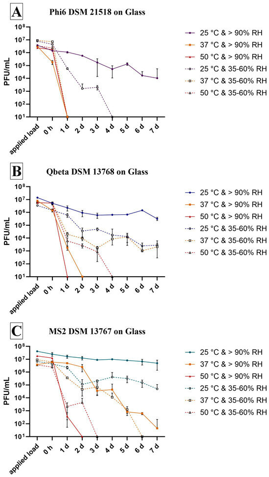 Bacteriophages can serve as practical surrogates for human viruses in laboratory tests. They share key structural characteristics but are non-pathogenic and can be handled under lower biosafety conditions. This facilitates experiments on persistence, disinfection and materials-testing while reducing time, costs and logistical requirements. However, phage survival strongly depends on many factors including environmental conditions, such as temperature and relative humidity (RH). This study investigates the survival of bacteriophages Phi6, Qbeta and MS2 under different incubation conditions including storage on a surface, in liquid and in the fridge. Standardized ISO protocols for antimicrobial surface testing and extensions were applied. All phages demonstrated good survival in liquid, although stability was temperature-dependent. At refrigerator temperatures, phages remained stable for several months with only minor reduction in the initial titer. At 50 °C, the two non-enveloped phages survived for up to one week, whereas the enveloped phage Phi6 was inactivated within one day. On glass surfaces, Phi6 exhibited reduced stability and was detectable only up to one week at 25 °C and >90% RH. Qbeta and MS2 survived from several days at 50 °C to two to seven days at 37 °C, depending on RH, and remained detectable at 25 °C regardless of humidity. These differences highlight the importance of carefully selecting incubation conditions, as these directly affect phage stability. In particular, unsuitable conditions for antimicrobial testing may cause phage inactivation and thus lead to false-positive results. Therefore, it is essential to define the conditions under which each phage produces reliable results.