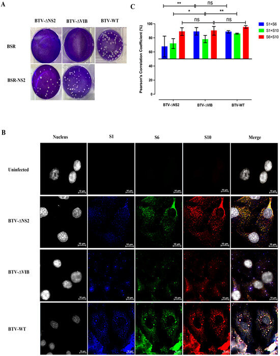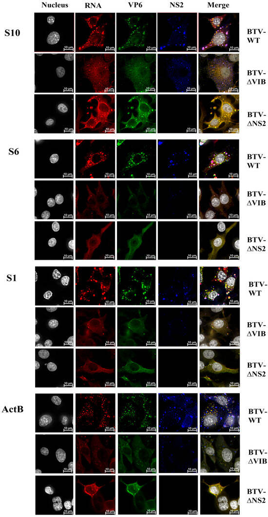 Bluetongue virus (BTV), with a genome of ten double-stranded RNA segments (S1–S10), is an emerging animal pathogen causing major economic losses in livestock worldwide. BTV replication involves RNA-RNA and RNA–protein interactions, with RNA-binding proteins, VP6 and NS2 playing key roles in genome assembly