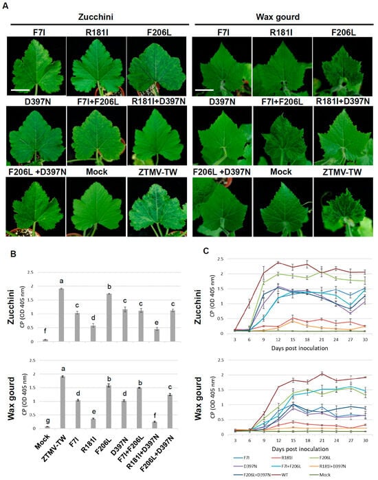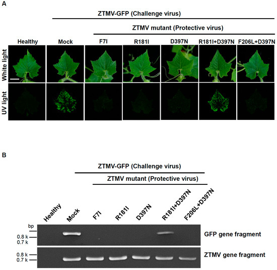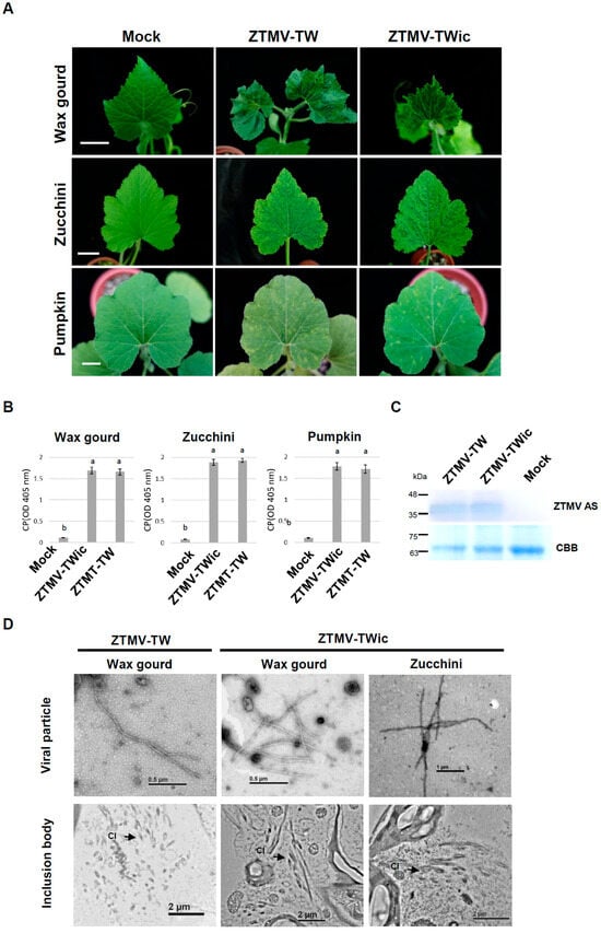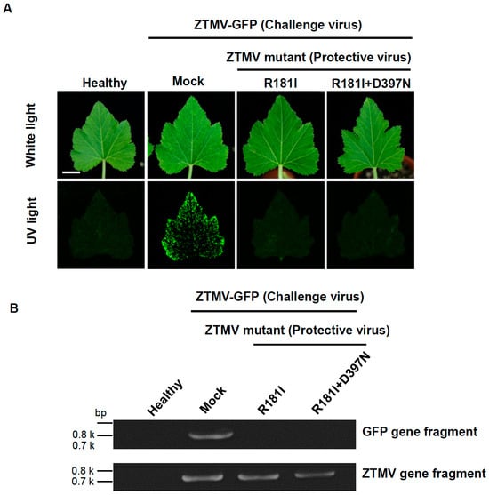 Zucchini tigre mosaic virus (ZTMV; Potyvirus pepotigris), which infects wax gourd (Benincasa hispida), was first identified in Taiwan in 2017 and designated ZTMV-TW. In this study, mild strains of ZTMV-TW were generated by modifying the pathogenicity factor HC-Pro to develop cross-protection strategies for cucurbit crops. A full-length infectious cDNA clone of ZTMV-TW was cloned in pCAMBIA1304 under the control of the CaMV 35S promoter (ZTMV-TWic). ZTMV-TWic induced typical potyvirus particles, cytoplasmic inclusion bodies, and severe symptoms in wax gourd, pumpkin, and zucchini plants. Conserved motifs of HC-Pro were mutated to generate four single mutants (F7I, R181I, F206L, and D397N) and three double mutants (F7I+F206L, R181I+D397N, and F206L+D397N). Mutants R181I and R181I+D397N caused mild or no symptoms in zucchini, while D397N and F206L+D397N were mild in wax gourd. Cross-protection assays showed that R181I and R181I+D397N provided complete protection against ZTMV-GFP in zucchini, whereas D397N and F206L+D397N conferred high protection in wax gourd. These results demonstrate the feasibility of host-specific mild strain selection for effective ZTMV cross-protection.