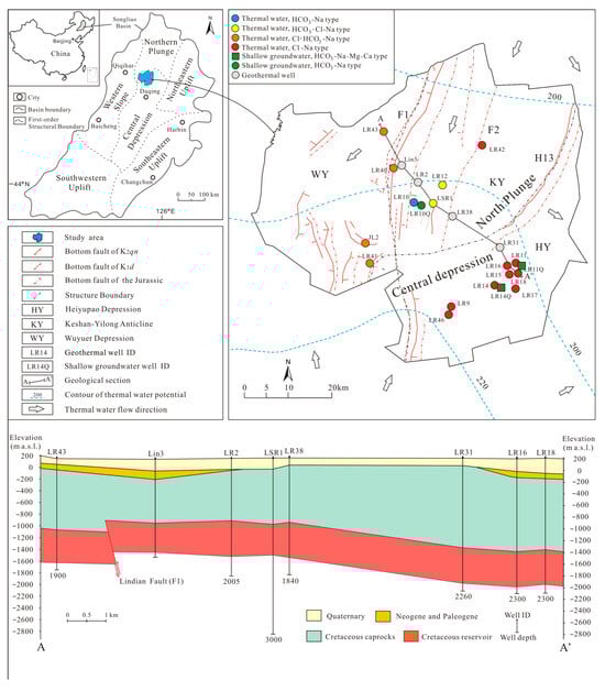 To explore the hydrogeochemical characteristics and dominant water–rock interaction processes of thermal water in Lindian geothermal field (northern Songliao Basin, NE China), this study analyzed 16 thermal water samples (1900–3000 m depth) and 3 shallow groundwater samples using hydrochemical indices, water isotopes, and