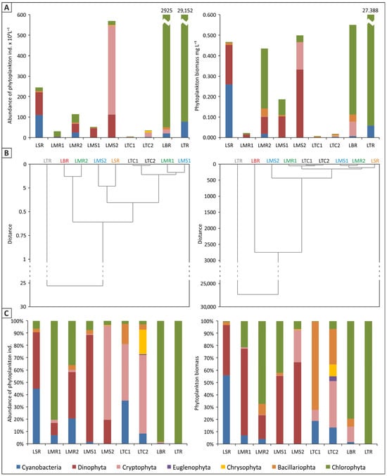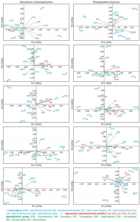 The small freshwater lakes of Spitsbergen remain poorly studied compared to surrounding marine ecosystems despite their sensitivity to rapid environmental changes. During the short ablation season, these shallow lakes exhibit physicochemical variability influenced by the harsh Arctic climate, local geology, and hydrology. This study analyzed six lakes located on marine terraces, moraine areas, and outwash plains in the Bellsund region to assess how physicochemical variability in their waters affects phytoplankton development. The lakes exhibited local and temporal variations in temperature, conductivity, ion composition, and nutrient levels, with generally low nutrient availability limiting biological productivity. Phytoplankton communities were quantitatively and qualitatively poor, dominated by green algae, either flagellates or mixed communities, including cyanobacteria. Green algae clearly dominated in lakes closest to the fjord shoreline, while dinoflagellates and cryptophytes dominated in inland lakes. Phytoplankton abundance and biomass were extremely low in one of the lakes situated on the raised marine terraces within the tundra vegetation zone (3 × 103 ind L−1 and 0.004 mg L−1, respectively). In contrast, the much larger lake situated within the tundra zone nearer the fjord shoreline had values that were comparable to fertile lakes in the temperate zone (~30 thousand × 103 ind L−1 and ~28 mg L−1, respectively). It should be noted that Monoraphidium contortum and Rhodomonas minuta dominated some of the lakes almost entirely. Phytoplankton abundance was related to physicochemical conditions: green algae increased with increasing ion concentrations (Cl−, Na+, K+, SO42−), Pmin, Fe, and Mn; flagellates preferred colder waters with higher Nmin and low TOC; cyanobacteria occurred in waters with lower COND, TOC, Ca2+, Si, Cu, and Zn. Phytoplankton biomass increased in July with increasing water temperature. Bird activity likely facilitated phytoplankton dispersal, increasing taxonomic diversity in frequently visited lakes.