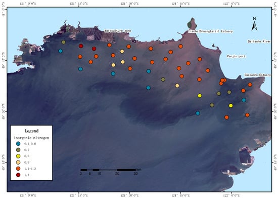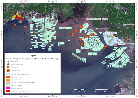 Based on an analysis of monitoring data from the Liaohe estuary, the distribution of inorganic nitrogen and active phosphate is related to the type of shoreline. The pollutant concentrations in the port area are 16% (inorganic nitrogen) and 59% (active phosphate) higher than