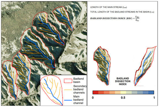 This study introduces the Badland Dissection Index (BDI), a new morphometric parameter that quantifies the internal dissection and drainage maturity of badland basins. The index was applied to 87 calanchi basins developed on marine clays in the Ionian sector of Basilicata (southern Italy).