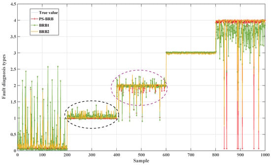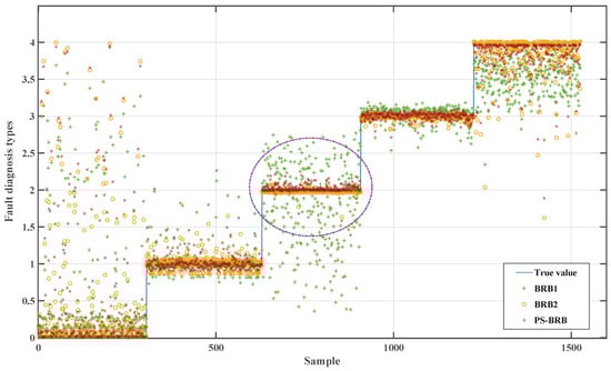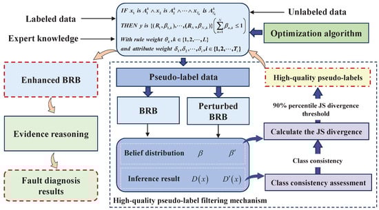 The fault diagnosis of complex systems is essential for ensuring operational safety. The belief rule base (BRB), a rule-driven framework based on expert knowledge, is widely applied in fault diagnosis because of its ability to manage uncertainty. However, existing BRB models rely heavily on large amounts of high-quality labeled data, and their performance decreases when labels are scarce or noisy. To address this limitation, a perturbed self-training-based BRB method (PS-BRB) is proposed. In this approach, pseudo-labels for unlabeled samples are first inferred by an initial BRB, and Gaussian noise is introduced into the inputs to simulate perturbations. Samples that produce consistent predictions before and after perturbation are retained through class consistency checking. The Jensen–Shannon (JS) divergence then measures the difference between belief distributions, and high-quality pseudo-labels are selected according to the 90th percentile criterion. These pseudo-labels are incorporated into the training set to optimize BRB rules and parameters. The method is validated on two bearing datasets, and the results show improved diagnostic accuracy and applicability, which indicates potential for use in practical engineering scenarios.
