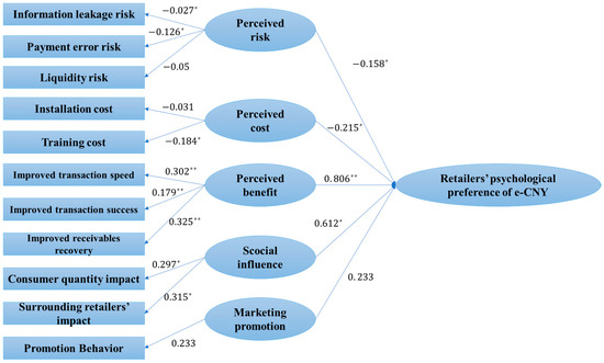 This study examines the public’s adoption preferences for China’s central bank digital currency (e-CNY) through an improved Unified Theory of Acceptance and Use of Technology framework. Analyzing 3509 consumer and 1630 retailer questionnaires, we investigate five psychological dimensions: perceived risk, cost, benefit, social influence, and marketing promotion. The findings reveal distinct adoption mechanisms: while perceived benefit drives both groups’ adoption intention, marketing promotion significantly influences consumers but shows a limited effect on retailers. Conversely, social influence substantially affects retailers while demonstrating minimal impact on consumers. Perceived cost negatively affects both groups, whereas perceived risk shows no significant deterrent effect. This research provides novel insights into CBDC adoption psychology and offers evidence-based guidance for differentiated promotion strategies targeting consumers and retailers, contributing to both technology adoption theory and CBDC implementation practice.