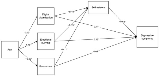 Digital victimization has been increasingly linked to adverse mental health outcomes during adolescence; however, less is known about its association with depressive symptoms when accounting for other forms of peer victimization and underlying psychological mechanisms. This study examined the relationship between lifetime digital victimization and depressive symptoms in a nationally representative sample of Chilean adolescents (N = 11,439) and tested the mediating role of self-esteem. Lifetime exposure to digital victimization, emotional bullying, and harassment were assessed using dichotomous indicators. Depressive symptoms were measured with the Birleson Depression Self-Rating Scale, and self-esteem with the Rosenberg Self-Esteem Scale. Overall, 27.2% of Chilean adolescents reported lifetime digital victimization. The proposed model showed an adequate fit to the data (CFI = 0.992; TLI = 0.942; RMSEA = 0.065; SRMR = 0.012). Lifetime exposure to digital victimization was directly associated with higher depressive symptoms and lower self-esteem, and self-esteem significantly mediated this association after controlling for age and in-person peer victimization. These findings highlight the importance of self-esteem as a key mechanism linking digital victimization and depressive symptoms in adolescents.