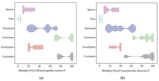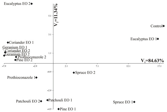 The increasing demand for sustainable agricultural practices has led researchers to explore alternative methods for controlling plant diseases and pests. Among these alternatives, essential oils (EOs) derived from various plant species have gained significant attention due to their broad-spectrum antimicrobial properties, which can be utilized in plant protection. Essential oils are volatile compounds that possess strong aromatic characteristics and are found in many medicinal and aromatic plants. They are known for their antifungal, antibacterial, and insecticidal activities, making them viable candidates for eco-friendly pest and disease management strategies. In this research, six essential oils—pine, patchouli, geranium, spruce, coriander, and eucalyptus oil—have been tested in vitro for controlling mycelium growth of Sclerotinia sclerotiorum, Botrytis cinerea, Alternaria brassicicola, and Cylindrosporium concentricum. The study also covers experiments in controlling pollen beetle and cabbage seed weevil (laboratory trials). In greenhouse conditions, the phytotoxicity of EOs to oilseed rape (Brassica napus L.) and the effect of these substances on the control of cornflower (Centaurea cyanus) were also tested. The results obtained indicate a large diversity of different essential oils in terms of their action on pathogens, pests, weeds, and winter rapeseed. Differences in their effectiveness were also found, depending on the applied dose.