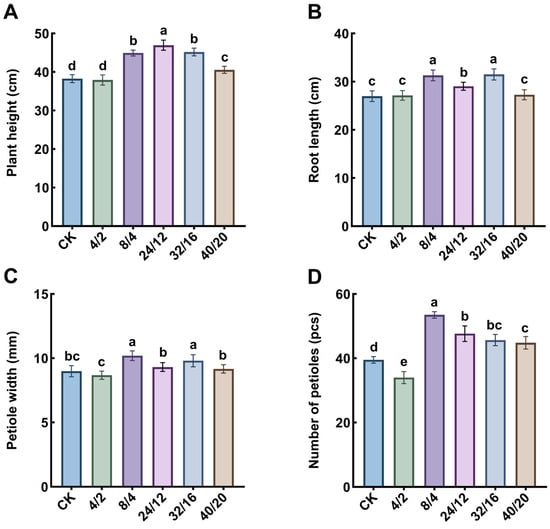 Celery (Apium graveolens L.) is a widely cultivated leafy vegetable of significant agronomic and nutritional importance. Owing to its high nutritional value, global demand for celery has steadily increased. However, under natural cultivation conditions, uncontrolled light exposure often prolongs the seedling stage and impairs celery growth quality. Improving the nutritional quality of celery through artificial regulation of the light environment has therefore become an important research focus. This work aimed to elucidate the impact of varying light–dark cycles on the growth characteristics and nutritional attributes of celery. Six light–dark cycle treatments (4 h/2 h, 8 h/4 h, 16 h/8 h, 24 h/12 h, 32 h/16 h, and 40 h/20 h) were applied, using ‘Oster Ziyu Xiangqin’ as the plant material under a constant light intensity of 400 μmol·m−2·s−1. The results revealed that the 24 h/12 h light–dark treatment significantly enhanced plant height, total fresh weight, and root vigor and showed superior performance in photosynthetic and chlorophyll fluorescence parameters. The 32 h/16 h treatment significantly enhanced the accumulation of soluble sugars, proteins, total phenolic compounds, and flavonoids, as well as the activities of antioxidant enzymes, while reducing nitrate-nitrogen levels. In conclusion, the 24 h/12 h light–dark cycle was most conducive to the growth and photosynthetic performance of celery, whereas the 32 h/16 h treatment optimally enhanced its nutritional quality and antioxidant capacity.