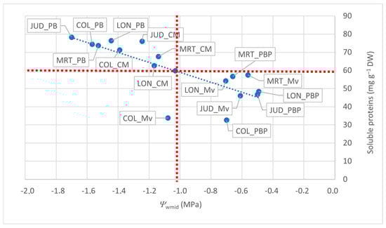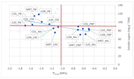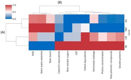Chestnut (Castanea sativa Mill.) is a key crop in Mediterranean regions increasingly threatened by recurrent drought stress. To investigate cultivar-specific tolerance mechanisms, we evaluated four Portuguese cultivars (Longal, Judia, Martaínha, and ColUTAD®) across four orchards with contrasting water regimes. Physiological (midday stem water potential—Ψwmid, soluble sugars, electrolyte leakage and proline) and biochemical traits (phenolics, flavonoids, catalase, peroxidase, ascorbate peroxidase and ferric reducing antioxidant power) were quantified under a natural drought gradient. Results revealed that environmental factors had a stronger influence than genetic background. Longal showed robust osmotic adjustment with high proline and soluble sugar levels, alongside stable starch reserves; Judia relied on inducible antioxidant activity, particularly peroxidase and ascorbate peroxidase; and Martaínha exhibited intermediate plasticity, whereas ColUTAD® was consistently stress-sensitive, with weaker defences and greater membrane damage. Clustering analysis confirmed that location effects outweighed cultivar differences, separating orchards into conservative strategies (better water balance, higher starch, stronger peroxidase activity) and stress-adaptive strategies (enhanced enzymatic antioxidants). Overall, resilience in chestnut is not determined by a single trait but by a synergistic network of osmotic regulation, membrane protection, and antioxidant activity. Traits such as proline accumulation, starch stability, and inducible enzyme activation emerged as reliable biochemical indicators of tolerance. These findings provide a physiological basis for selecting climate-resilient cultivars and designing site-specific management strategies, thereby supporting the sustainability of chestnut production under Mediterranean climate change scenarios.