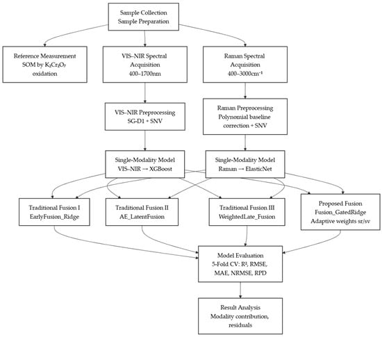 The fusion of Raman and visible–near-infrared (VIS–NIR) spectroscopy provides a promising pathway for rapid and non-destructive soil analysis. However, conventional fusion strategies often fail to properly balance modality discrepancies and complementary information. To address this limitation, this study develops an adaptive Gated Ridge