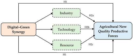 The synergy between agricultural digitalization and greening is an inherent requirement for high-quality agricultural development and is a vital pathway for cultivating agricultural new quality productive forces (ANQPFs). Based on 2012–2023 provincial-level data from 30 Chinese provinces, this study constructs comprehensive evaluation index systems for agricultural digitalization, greening, and ANQPFs. A coupling coordination model is applied to measure the degree of digital–green synergy, and a two-way fixed effects model is employed to test its impact on ANQPFs, along with the underlying mechanisms and regional heterogeneity. The results indicate that digital–green synergy significantly enhances ANQPFs. A 1% increase in the synergy index improves ANQPFs by 29.6%, primarily through industrial structure optimization, technological innovation stimulation, and resource allocation efficiency improvement. The positive effect is most prominent in the central region, after Digital Village Strategy implementation, and in major grain-producing areas. This study innovatively integrates digitalization and greening into the analytical framework of agricultural productivity, expanding the theoretical understanding of how synergistic transformation drives high-quality agricultural development. Regarding policy, governments should strengthen coordination between digital and green policies, promote the integration and innovation of related technologies, and foster an enabling environment that supports the formation and evolution of new quality productive forces in agriculture.
