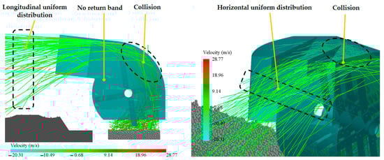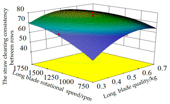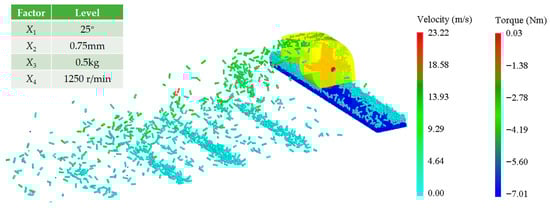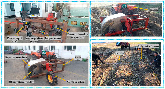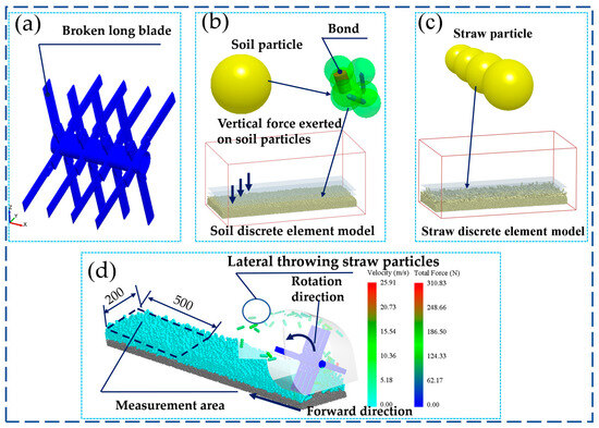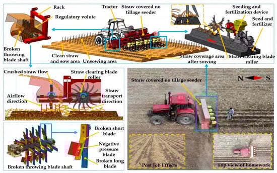 To address issues such as slow soil temperature recovery and delayed sowing periods caused by straw mulching in the cold regions of northern Heilongjiang Province, this study designed a straw crushing and scattering device compatible with the 2BMFJ series no-till planters, aiming to achieve moderate straw fragmentation and uniform distribution. By establishing mathematical models for the straw pick-up, crushing, and scattering processes, key parameters affecting the device’s performance were determined. Utilizing the discrete model of EDEM 2018 software virtual simulation experiments were conducted based on response surface methodology. The test factors included the blade angle of the crushing long blade, the edge thickness of the crushing long blade, the weight of the crushing long blade, and the rotational speed of the crushing long blade. The performance evaluation indicators were the straw pick-up rate, straw crushing rate, power consumption, and inter-row straw coverage consistency. The optimal parameter combination was identified to be a blade angle of 25°, an edge thickness of 1.25 mm, a weight ranging from 0.35 to 0.41 kg, and a rotational speed between 1400 and 1750 r/min, resulting in a straw pick-up rate of 83%, a straw crushing rate of 84%, power consumption of 6.8 KW, and a straw cleaning consistency between rows of 75%. Field test results indicated that the straw pick-up rate reached 87.2%, the straw crushing rate achieved 81.5%, power consumption was 7.7 kW, and the straw cleaning consistency between rows attained 79.3%. The deviations from simulation results were within acceptable limits. This equipment can effectively complete straw crushing and scattering operations, thereby creating favorable seedbed conditions.