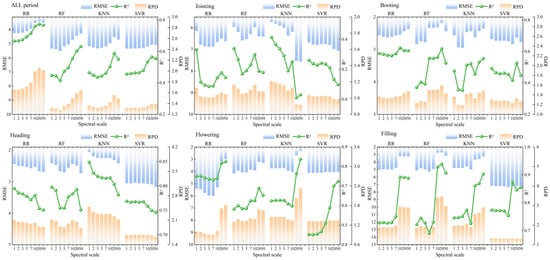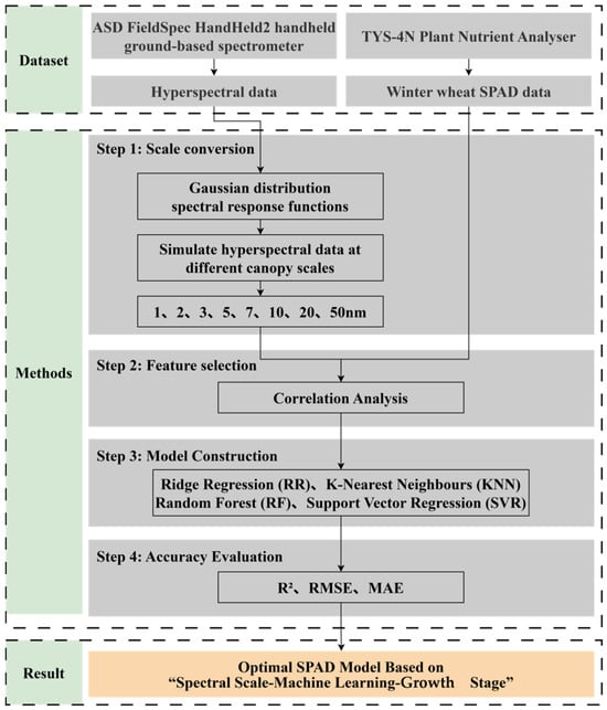 Chlorophyll serves as a crucial indicator for crop growth monitoring and reflects the health status of crops. Hyperspectral remote sensing technology, leveraging its advantages of repeated observations and high-throughput analysis, provides an effective approach for non-destructive chlorophyll monitoring. However, determining the optimal spectral scale remains the primary bottleneck constraining the widespread application of hyperspectral remote sensing in crop chlorophyll estimation: excessively fine spectral scale readily introduces redundant information, leading to dramatically increased data dimensions and reduced computational efficiency; conversely, overly coarse spectral scale risks losing critical spectral features such as absorption peaks and reflection troughs, thereby compromising model accuracy. Therefore, establishing an appropriate spectral scale that effectively preserves spectral feature information while maintaining computational efficiency is crucial for enhancing the accuracy and practicality of chlorophyll remote sensing estimation. To address this, this study proposes a three-dimensional analytical framework integrating “spectral scale—machine learning algorithm—crop growth stage” to systematically solve the scale optimization problem. Ground-truth measurements and hyperspectral data from five growth stages of winter wheat in Fengyang County, Anhui Province, were collected. Spectral bands sensitive to chlorophyll were analyzed, and four modeling methods—Ridge Regression (RR), K-Nearest Neighbors (KNN), Random Forest (RF), and Support Vector Regression (SVR)—were employed to integrate data from different spectral scales with respective bandwidths of 2, 3, 5, 7, 10, 20, and 50 nanometers (nm). The results evaluated the response characteristics of raw band reflectance to chlorophyll values and its impact on machine learning-based chlorophyll estimation across different spectral scales. Results indicate: (1) Canopy spectra significantly correlated with winter wheat chlorophyll primarily reside in the red and red-edge bands; (2) For single-scale analysis, larger spectral scales (10, 20 nm) enhance monitoring accuracy compared to 1 nm high-resolution data, while medium and small scales (5, 7 nm) may degrade accuracy due to redundant noise introduction. (3) Integrating growth stages, spectral scales, and machine learning revealed optimal monitoring accuracy during the jointing and heading stages using 1–5 nm spectral scales combined with the KNN algorithm. For the booting, flowering, and grain filling stages, the highest accuracy was achieved using 20–50 nm spectral scales combined with either the KNN or RF algorithm. The results indicate that high-precision chlorophyll inversion for winter wheat does not rely on a single fixed model or scale, but rather on the dynamic adaptation of the “scale-model-growth stage” triad. The proposed systematic framework not only provides a theoretical basis for chlorophyll monitoring using multi-platform remote sensing data, but also offers methodological support for future crop-sensing sensor design and data processing strategy optimization.