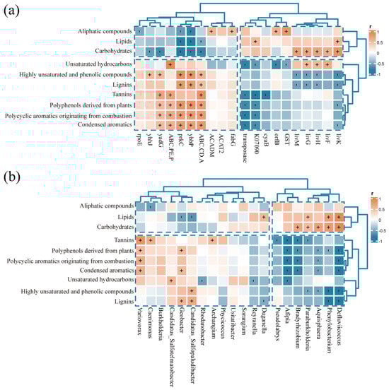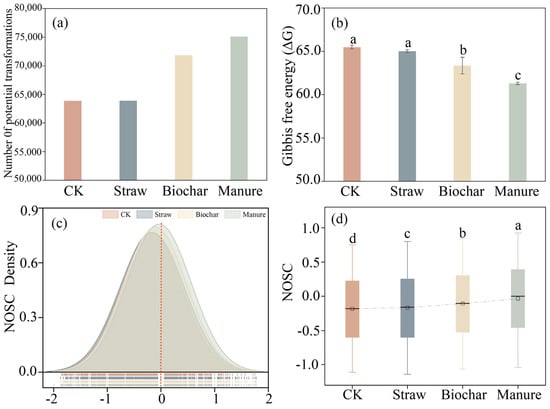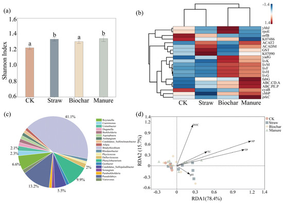 Dissolved organic matter (DOM) is a crucial carbon source for soil microorganisms and plays a vital role in nutrient cycling and carbon (C) sequestration in soils. However, the extent to which soil microbes mediate DOM transformation at the molecular level, and whether this is regulated by different organic fertilization, remains unclear. Here, we designed a field experiment to investigate the transformations of DOM under three types of organic fertilization (straw, biochar, and manure) using Fourier transform ion cyclotron resonance mass spectrometry and metagenomic analysis. Compared to the control, manure fertilization increased the molecular chemodiversity of DOM by 33.2%, with recalcitrant compounds (e.g., highly unsaturated phenolic compounds and lignins) increasing by 47.2%. In contrast, labile compounds (e.g., aliphatics) decreased by 73.5%. Compared to straw treatment, manure application significantly increased the average conversion rate of dissolved organic matter (DOM). This process was accompanied by a significant increase in the Shannon index of the soil microbial community (p < 0.05) and upregulation of ABC transporter-encoding genes (e.g., livK, livM). DOM composition directly governed transformation potential (p < 0.01), whereas functional genes enhanced transformation indirectly by modulating DOM composition. This study elucidates microbial-mediated DOM transformation mechanisms under varying organic fertilization practices, providing a scientific basis for optimizing soil organic matter management in paddy ecosystems.