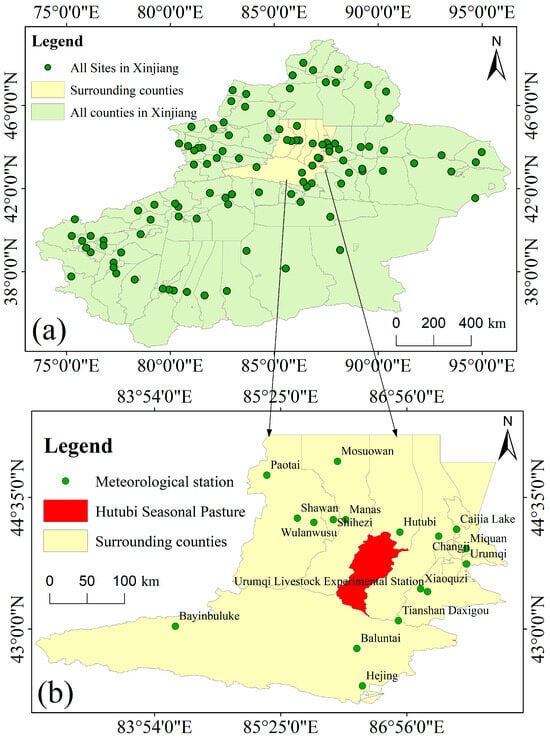 Grazing pressure (GP) was a key factor influencing net primary productivity (NPP) in pasturelands and was characterized by two indicators: grazing intensity (GI) and grazing density (GD). However, current research has not yet clarified whether the mechanisms linking GP to NPP varied by season, or whether seasonal thresholds of grazing pressure existed. This study employed the Carnegie–Ames–Stanford Approach (CASA) model to estimate NPP over eight time periods between 2010 and 2024 for three seasonal pastures (spring–autumn, summer, and winter) in the study area. Estimation accuracy was evaluated by comparing our NPP estimates with existing NPP products. Trends in NPP and their significance were analyzed using the Sen–MK method, followed by further examination of spatiotemporal variations in NPP across the three seasonal pastures. Subsequently, by comparing two grazing pressure indicators (GI and GD), we identified the optimal metric to represent GP and, on this basis, analyzed the spatiotemporal variations and threshold dynamics of pasture NPP across three seasons under the influence of GP. Results indicated that the CASA model achieved R2 > 0.90 for multi-year NPP estimation, with RMSE ranging from 27 to 45 g C m−2 y−1. Spring–autumn and winter pastures exhibited pronounced slope changes and intense spatiotemporal NPP variations, whereas summer pastures showed insignificant slope changes and stable spatiotemporal NPP patterns. Of the two GP indicators, the GD metric developed herein more effectively characterized grazing pressure across the study area. Across the three seasonal pastures, a consistent negative feedback between GD and NPP was evident; however, its strength differed markedly, with spring–autumn and winter pastures exhibiting greater NPP sensitivity to GD. The GD thresholds for spring–autumn, summer, and winter pastures in the study area were approximately 900, 700, and 5000 sheep km−2, respectively. Exceeding these thresholds led to degradation, while falling below them promoted recovery. The study revealed a threshold-mediated negative feedback between GD and NPP across seasonal pastures, quantified season-specific upper bounds of carrying capacity, and provided an evidence base for zoned rest/rotational grazing and GD regulation along the northern slope of the Tianshan Mountains.