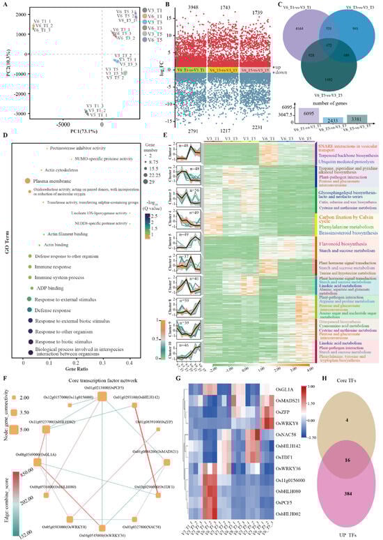 Japonica rice is susceptible to cold stress at the booting stage, yet the systematic molecular mechanisms underlying varietal disparities in cold tolerance at this stage remain poorly understood. To fill this research gap, cold-tolerant LG1934 (V3) and cold-sensitive KD8 (V6) were subjected to
