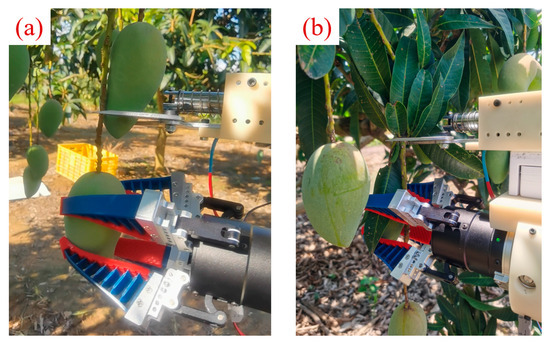 Mango is the second most widely cultivated tropical fruit in the world. Its harvesting mainly relies on manual labor. During the harvest season, the hot weather leads to low working efficiency and high labor costs. Current research on automatic mango harvesting mainly focuses on locating the fruit stem harvesting point, followed by stem clamping and cutting. However, these methods are less effective when the stem is occluded. To address these issues, this study first acquires images of four mango varieties in a mixed cultivation orchard and builds a dataset. Mango detection and occlusion-state classification models are then established based on YOLOv11m and YOLOv8l-cls, respectively. The detection model achieves an AP0.5–0.95 (average precision at IoU = 0.50:0.05:0.95) of 90.21%, and the accuracy of the classification model is 96.9%. Second, based on the mango growth characteristics, detected mango bounding boxes and binocular vision, we propose a spatial localization method for the mango grasping point. Building on this, a mango-grasping and stem-cutting end-effector is designed. Finally, a mango harvesting robot system is developed, and verification experiments are carried out. The experimental results show that the harvesting method and procedure are well-suited for situations where the fruit stem is occluded, as well as for fruits with no occlusion or partial occlusion. The mango grasping success rate reaches 96.74%, the stem cutting success rate is 91.30%, and the fruit injury rate is less than 5%. The average image processing time is 119.4 ms. The results prove the feasibility of the proposed methods.