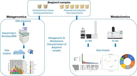 Overuse of synthetic pesticides and fertilizers has increased concerns regarding environmental and human health. Indian natural farming practices, which are mainly based on different bioformulations, provide sustainable alternatives to conventional farming. Among other bioformulations, Beejamrit is a cow-based biostimulant that is used for seed treatment to promote seed germination, seed vigor, and tolerance to pathogens. In this study, 16S rRNA amplicon metagenomics and untargeted metabolomics (GC-MS and LC-MS) approaches were employed to evaluate microbial and metabolic profiles of Beejamrit samples, respectively. Metagenomic analysis indicated that Beejamrit consisted of different plant-growth-promoting bacteria, such as Advenella, Comamonas, Lysinibacillus, Acinetobacter, and Arcobacter. GC-MS analysis discovered organoheterocyclics (23%) to be the most prevalent metabolite group in Beejamrit, followed by organic acids (18%) and benzenoids (15%). In LC-MS analysis, lipids (26%) were most abundant, followed by organoheterocyclics (18%) and organic acids (18%). Furthermore, GC-MS and LC-MS analyses identified a wide range of metabolites, including amino acids, organic acids, phenolics, and fatty acids. These findings confirm that Beejamrit contains a wide array of beneficial bacteria and bioactive compounds, thereby elucidating the potential mechanisms behind its efficacy as an effective seed treatment agent. The study offers an initial framework for further standardization and wider application in sustainable agriculture.