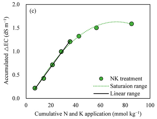 Improving nutrient use efficiency and minimizing environmental pollution from excessive fertilization require appropriate nutrient management supported by continuous monitoring of soil nutrient levels during crop growth. As only a few real-time sensors for the measurement of soil nutrients are available, this study evaluated the potential of electrical conductivity (EC) sensors, which reflect the ionic concentrations of the soil solution, for real-time estimation of plant-available nutrient levels. Nitrogen and potassium were sequentially supplied to achieve cumulative application rates of 25–300% of the nutrient uptake-based fertilization rate. The relationship between cumulative fertilization rate and accumulated sensor-based EC increase was described using linear, polynomial, and nonlinear saturation models. Sensor EC increased linearly from 25 to 125% of the nutrient uptake-based fertilization rate, while higher application rates were better explained by the nonlinear saturation equation. Sensor-based EC showed strong correlation with soil ammonium nitrogen (NH4+-N), indicating that the sensor effectively reflected nutrient dynamics. In open-field pepper soil, fertigation-induced increases in sensor EC followed the patterns predicted by both the linear and nonlinear saturation models established in the laboratory. These results demonstrate that EC sensors can be used for real-time monitoring of soil nutrient levels and may contribute to efficient nutrient management in open-field cultivation.